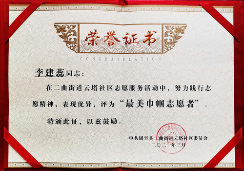 李建蕊被云塔社區評為“最美巾幗志愿者”