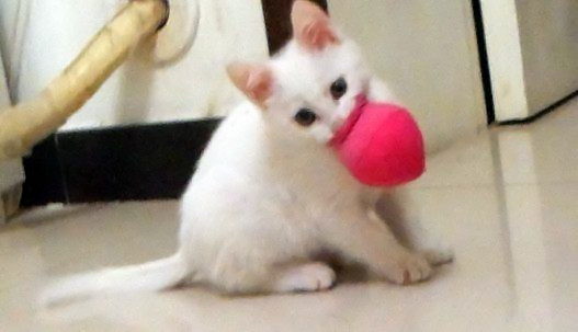 ? ? 她也變得活潑調皮起來,我下班后經常跟她玩耍,她會躲在門后跟你捉迷藏,喜歡粘著你,你在房間里走動,它會跟在你屁股后面轉,你在床上,她也跳上去跟你玩,你跟她吊臉她也躲的你遠遠地。喜歡寵物玩具娃娃,拋出去的玩具娃娃她會像小狗一樣叼到你跟前來。喜歡看電視,趴在電視跟前,和畫面打鬧,在和其它小動物玩耍時也知道保護自己。但也有調皮任性的時候,她跳躍的能力很強,有時你一天不在家,她會上冰箱頂、空調頂和一米多高的桌子,大鬧天宮,為這我熊過她幾次,最后算是改過了。